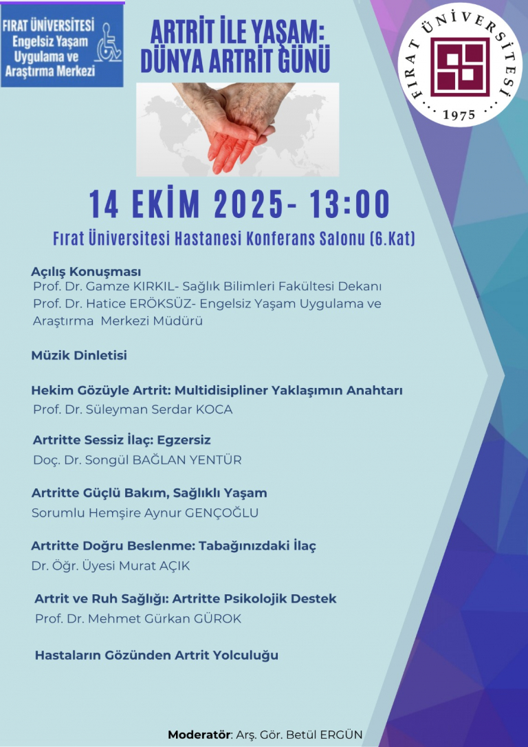 Üniversitemiz Engelsiz Yaşam Uygulama ve Araştırma Merkezi ile Sağlık Bilimleri Fakültesi tarafından, 14 Ekim 2025 Salı günü saat 13.00’te Fırat Üniversitesi Hastanesi Konferans Salonu’nda “Artrit ile Yaşam: Dünya Artrit Günü” başlıklı etkinlik gerçekleştirilecektir.